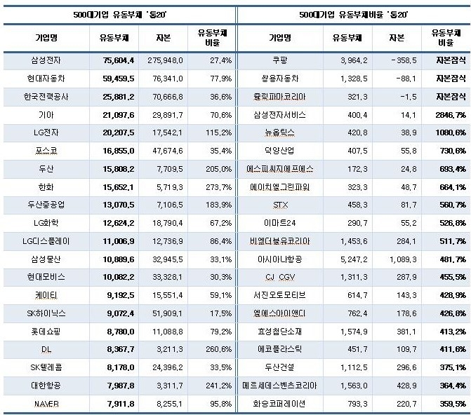 기업별 유동부채 규모는 삼성전자(75조6천44억원), 현대자동차(59조4천595억원), 한국전력공사(25조8천812억원), 기아(21조976억원), LG전자(20조2075억원), 포스코(16조8천550억원) 등의 순으로 컸다.