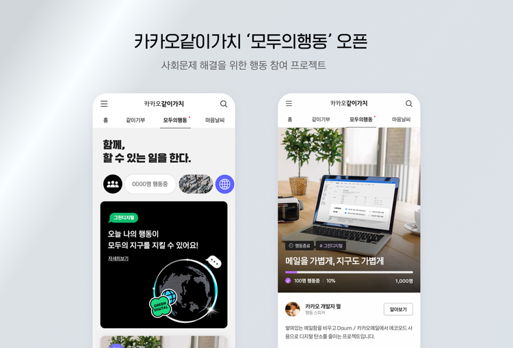 모두의행동은 개인의 사소한 행동이 모이면 사회를 변화시킬 수 있다는 취지로 마련한 프로젝트다. 이용자가 프로젝트에서 진행하는 캠페인 정보를 공유하거나 관련 행동을 실행하고 인증함으로써 다른 사람들과 함께 캠페인을 응원하는 자발적 참여 방식이다. 카카오같이가치 홈페이지에서 관련 캠페인 정보를 확인하고 쉽게 참여할 수 있다.
