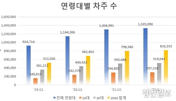 4월 말 기준 은행권 전세대출을 차주 가운데 20·30대 수는 총 81만6천353명으로, 전체 차주(133만5천90명)의 61.1%를 차지했다. 2019년 말경 2030대 전세대출 차주의 비중은 56.5% 수준이었다.