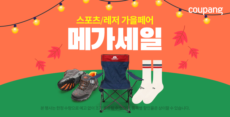 【 청년일보 】 쿠팡은 운동하기 좋은 가을을 맞이해 ‘스포츠·레저 가을페어 메가세일’을 오는 10월 9일까지 진행한다고 27일 밝혔다.