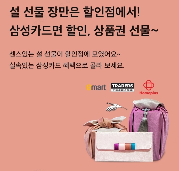 삼성카드 관계자는 "민족 최대의 명절 설날을 맞이하여 설 선물을 실속있게 구매할 수 있는 설 맞이 이벤트를 준비했다"며 "앞으로도 고객들에게 유용한 혜택을 지속적으로 제공할 계획"이라고 전했다.