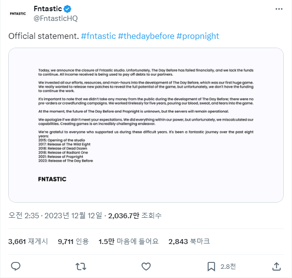판타스틱은 이날 공식 X(구 트위터)에 "첫 작품인 '더 데이 비포'에 모든 자원과 노력, 인력을 투자해 게임의 잠재력을 끌어 올리고 싶었지만, 안타깝게도 더이상의 여력이 없다"고 게시했다.