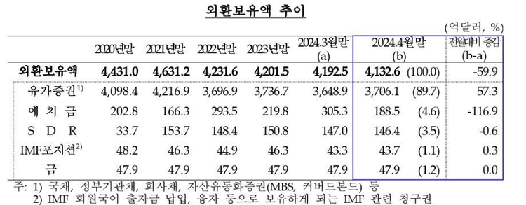 한국은행이 7일 발표한 외환보유액 통계에 따르면 지난달 말 기준 외환보유액은 4천132억6천만달러(약 561조6천억원)로, 3월 말(4천192억5천만달러)보다 59억9천만달러 감소했다.