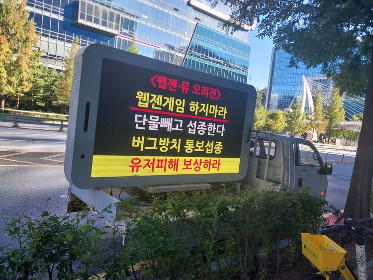 【 청년일보 】 한국게임이용자협회(게임이용자협회)는 23일 경기도 성남시 분당구 웹젠 본사 앞에서 웹젠이 서비스하는 게임 '뮤 오리진', '뮤 아크엔젤', '어둠의 실력자가 되고 싶어서!'의 세 게임 이용자들이 연대해 결성한 '웹젠 게임 피해자 모임(이하 피해자 모임)'과 함께 위 각 게임의 운영과 관련해 문제를 제기하고 정상화를 촉구하는 트럭시위를 진행하고 성명문을 배포했다고 밝혔다.