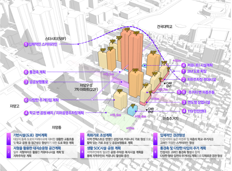 아울러 단지 중심부에 초고층 랜드마크형 주동을 배치하고 자양번영로 변에는 중저층 연도형 주동을, 인접 주거지 경계부에는 중층 주동을 두는 단계적 스카이라인을 형성해 주변과 조화로운 입체적 도시경관을 만들 예정이다.