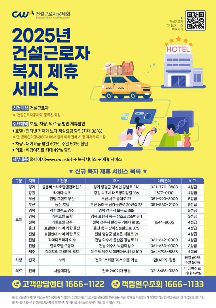 【 청년일보 】 건설근로자공제회(공제회)가 건설근로자 복지 증진을 위해 호텔, 차량, 의료 등 다양한 분야의 민간기업과 업무제휴를 넓히고 있다.