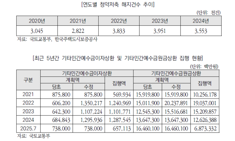 한 주택금융 전문가는 "12조원이 넘는 원금 상환 예산은 기금 재원 배분의 왜곡을 보여주는 지표"라며 "신규 주택 구입이나 전세 융자 등 본래의 정책 목적에 쓰여야 할 재원이 기존 가입자의 이탈을 막는 '방어적 운용'에 투입되고 있는 셈"이라고 지적했다.