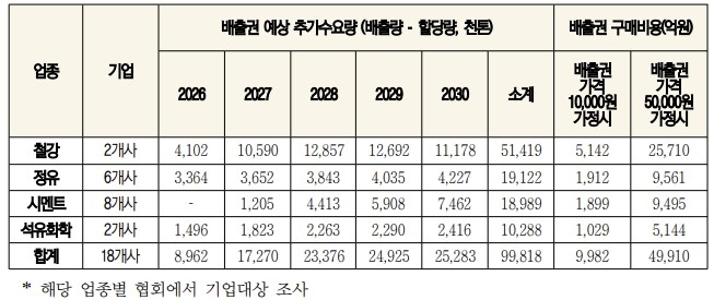 주요 업종별 협회의 조사 결과를 보면 4차 계획기간 동안 배출권 추가 구매 예상량은 철강 5,141만9천t, 정유 1,912만2천t, 시멘트 1,898만9천t, 석유화학 1,028만8천t 등에 달할 것으로 나타났다. 배출권 가격을 5만 원으로 가정할 경우, 총 구매 비용은 약 5조 원에 이를 것으로 추산된다.