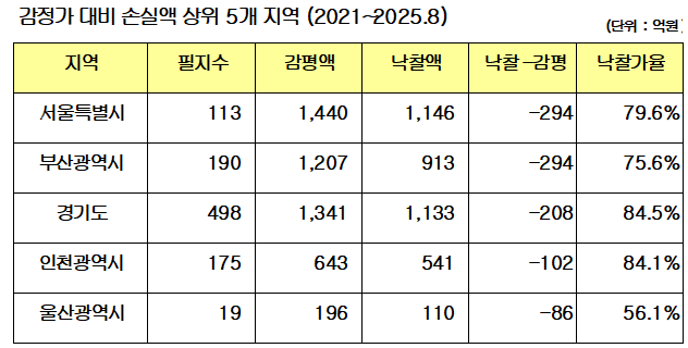 이로 인해 2023년부터 2025년 8월까지 발생한 국가 손실(감정가-낙찰가)은 총 1천339억원에 달했다.