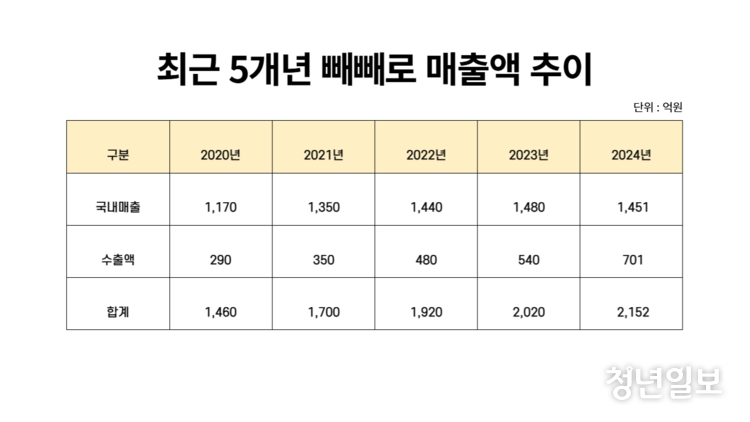 국내 매출은 2020년 1천170억원에서 지난해 1천451억원으로 늘었고, 같은 기간 수출액도 290억원에서 701억원으로 두 배 이상 증가했다. 이에 따라 전체 매출은 2020년 1천460억원에서 지난해 2천152억원으로 성장하며 5년 만에 약 47% 증가했다.