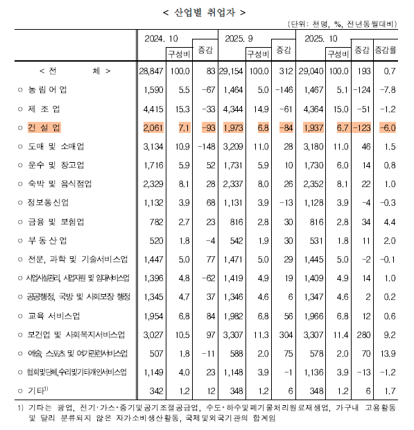 국가데이터처(통계청)가 지난 12일 발표한 '2025년 10월 고용동향'에 따르면, 건설업 취업자 수는 193만7천명으로, 206만1천명이던 전년 동월 대비 12만3천명(-6.0%)이나 급감했다.