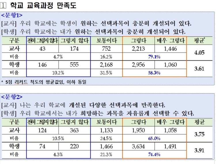 다만 '우리 학교에서는 내가 희망하는 과목을 자유롭게 선택할 수 있다'는 설문에는 학생 74.4%가 긍정적으로 답변해 차이를 보였다.