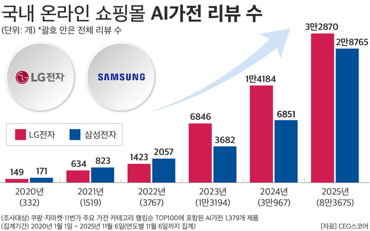 지난 2020년 332건에 불과했던 AI 가전기기에 대한 리뷰수는 2021년 1천519건, 2022년 3천767건, 2023년 1만3천194건, 2024년 3만967건으로 증가했고, 2025년 11월 말 8만3천675건으로 가파른 상승세를 기록했다.
