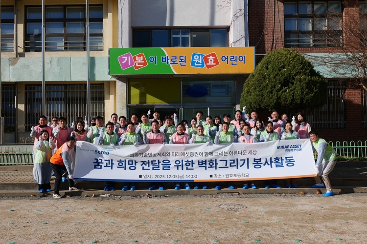 【 청년일보 】 미래에셋증권과 과학기술인공제회는 지난 5일 서울 용산구 원효초등학교에서 합동 벽화 그리기 봉사활동을 진행했다고 8일 밝혔다.