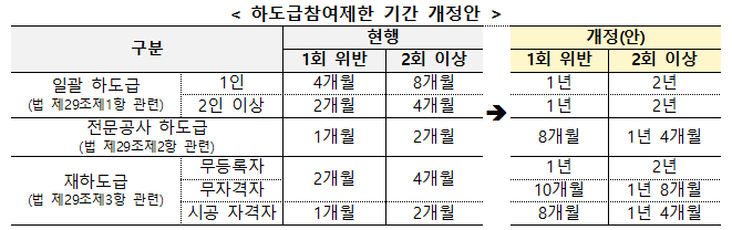 불법하도급으로 행정처분을 받은 업체는 기존 1~8개월이던 제한 기간이 8개월에서 최대 2년으로 확대 적용된다.