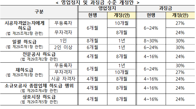 영업정지 기간은 현행 4~8개월에서 최소 8개월에서 최대 1년으로 늘어나고, 징금 부과 기준 역시 기존 4~30%에서 전체 하도급 대금의 24~30%로 상향된다. 이는 현행법상 가능한 최고 수준의 처분이다.