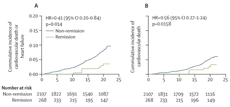 정상범위 회복 그룹과 비회복 그룹의 심혈관질환 사망과 심부전 입원 위험은 정상범위 회복 그룹이 비회복 그룹보다 각각 미국 DPPOS에서 59% 낮았고, 중국 DaQingDPOS에서 51% 낮았다.
