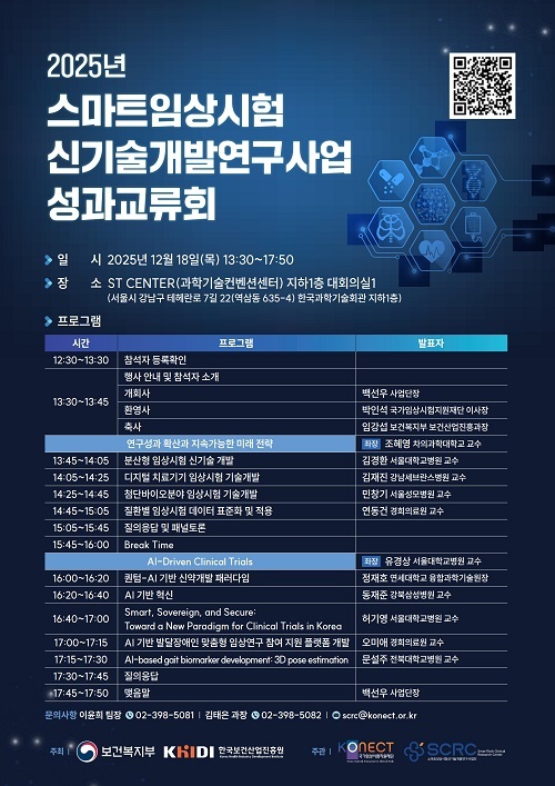 2부에서는 ‘AI-Driven Clinical Trials’를 주제로 인공지능과 첨단 기술이 우리나라 임상시험의 패러다임을 어떻게 변화시키고 있는지에 대한 발표가 진행되며, AI 기반 임상시험 생태계 구축 필요성과 향후 협력 방향성을 공유한다.