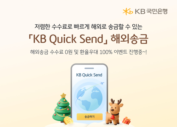 이번 서비스 확대는 오는 1월 1일 정부의 무증빙 해외송금 한도 체계 개편에 발맞춰 해외송금 고객의 실질적 비용 부담을 낮추기 위한 조치로, 국민인 거주자는 건당 미화 5천 달러까지 'KB Quick Send' 해외송금 서비스 이용이 가능하다.