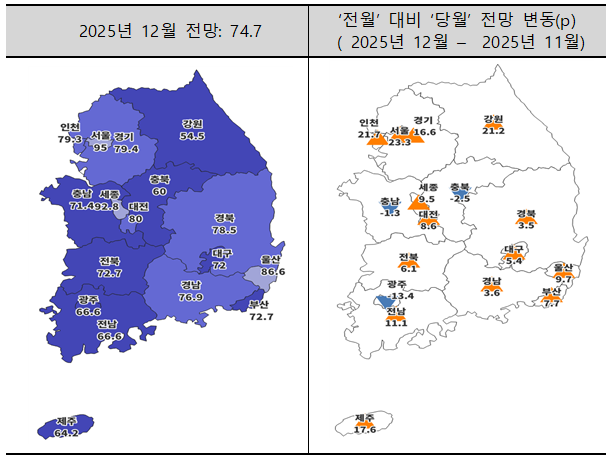 수도권 지수는 전월 대비 20.4p 급등한 84.5로 집계됐다. 서울은 23.3p 오른 95.0을 기록하며 기준선(100)에 근접했고, 인천(79.3)과 경기(79.4)도 각각 21.7p, 16.6p 상승하며 회복세를 견인했다.
