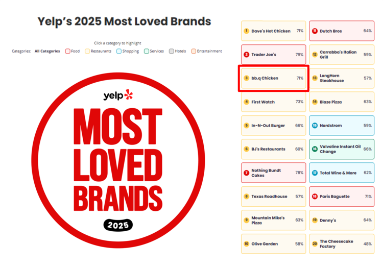 이번 옐프가 발표한 '가장 사랑받는 브랜드' 순위는 브랜드 평점, 재방문 고객 평가, 브랜드 검색량, 리뷰 수 등을 종합 분석해 선정됐다. BBQ는 이 평가에서 높은 소비자 만족도와 브랜드 호감도를 인정받으며 전체 3위에 올랐다.