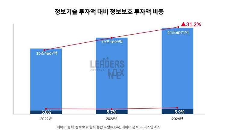 23일 리더스인덱스 조사에 따르면, 매출 상위 500대 기업 중 정보보호 공시 종합 포털에 자료를 공개한 87개 사의 정보기술부문 투자액은 2022년 16조4천667억원에서 2024년 21조6천71억원으로 31.2% 증가했다. 같은 기간 정보보호부문 투자는 9천602억원에서 1조2천756억원으로 32.8% 늘었다.