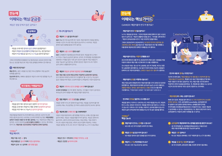 그동안의 연구 결과를 토대로 게임이용이 곧바로 게임이용장애라는 질병으로 이어지지 않으며, 질병 코드 등재를 뒷받침할 과학적 근거가 충분하지 않다는 점을 쉽게 설명하고 건강한 이용 습관을 기르기 위한 실천 방안을 함께 제시했다.