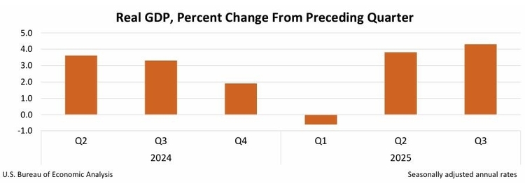 【 청년일보 】 23일(현지시간) 미국 상무부는 3분기 미국의 국내총생산(GDP) 증가율이 4.3%(전기 대비 연율)로 집계됐다고 밝혔다.