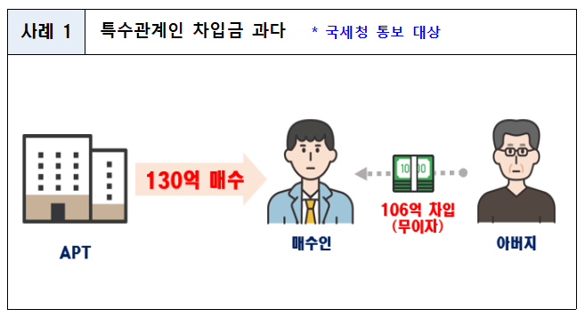 서울 소재 아파트를 130억원에 매수한 A씨는 매수 대금의 대부분인 106억원을 부친으로부터 차용증 없이 무이자로 빌린 사실이 드러나 국세청 통보 대상이 됐다.