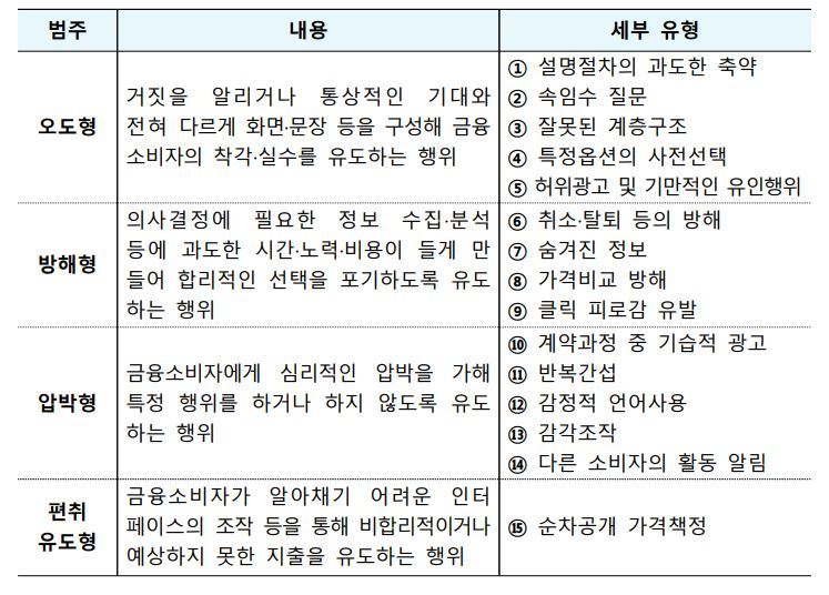 가이드라인은 ▲오도형 ▲방해형 ▲압박형 ▲편취유도형 등 4개의 범주, 15개 세부유형으로 구분됐다.