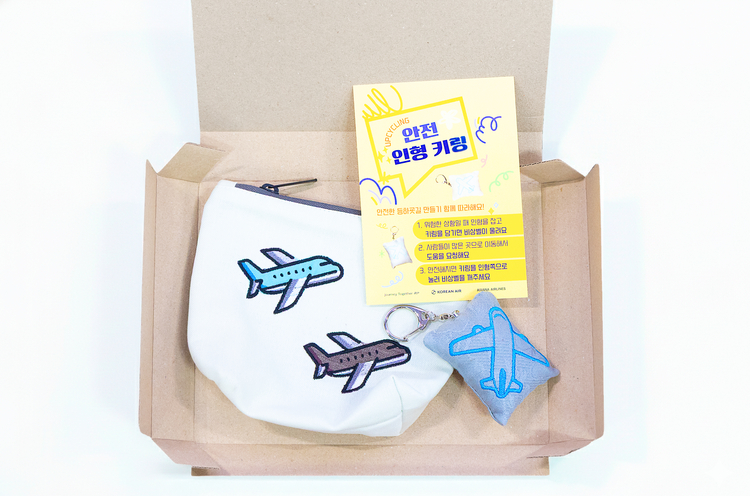 키링과 함께 기부하는 파우치 또한 대한항공 기내 테이블보와 양사 객실승무원이 반납한 유니폼으로 만들어졌다. 파우치 겉면에 부착된 장식용 비행기 패치를 디자인 포인트로 담아냈다.
