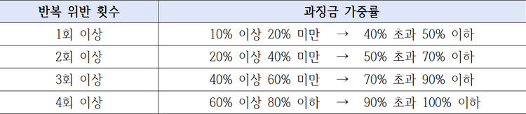 재발 방지를 위해 반복 법 위반에 대한 가중 규정도 대폭 강화된다. 현재는 1회 반복 시 10% 가중에 그쳤지만, 앞으로는 1회 반복만으로도 최대 50%, 반복 횟수에 따라 최대 100%까지 과징금을 가중할 수 있도록 한다.