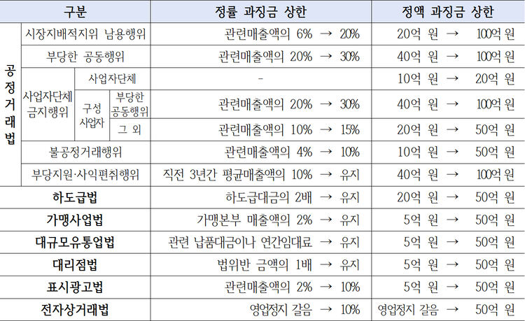 또 관련매출액 산정이 어려운 경우 적용되는 정액 과징금의 한도도 전반적으로 상향된다. 대표적으로 부당지원행위의 정액 과징금 상한은 40억원에서 100억원으로 확대된다.