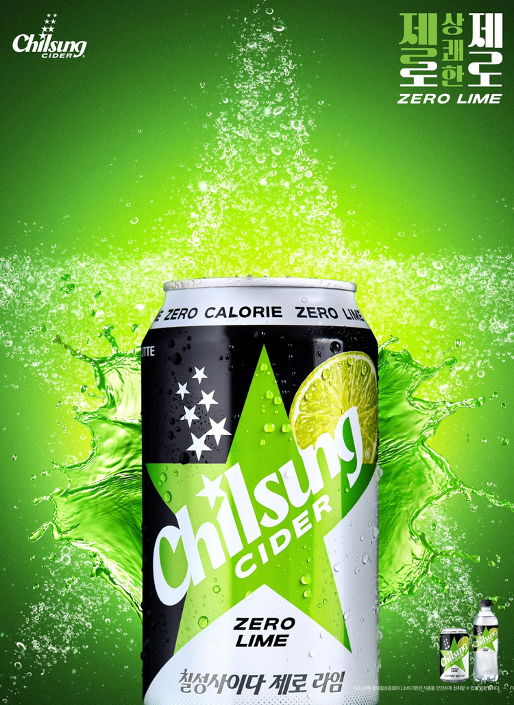 제품 패키지는 칠성사이다 고유 디자인을 유지하면서 라벨 중앙에 연두색 컬러의 별 엠블럼과 라임 이미지를 담았고, 제로 라임이라는 제품 네이밍을 통해 라임향과 시원하고 청량한 제품 속성을 소비자들이 보다 직관적으로 인지할 수 있도록 표현한 점이 특징이다.