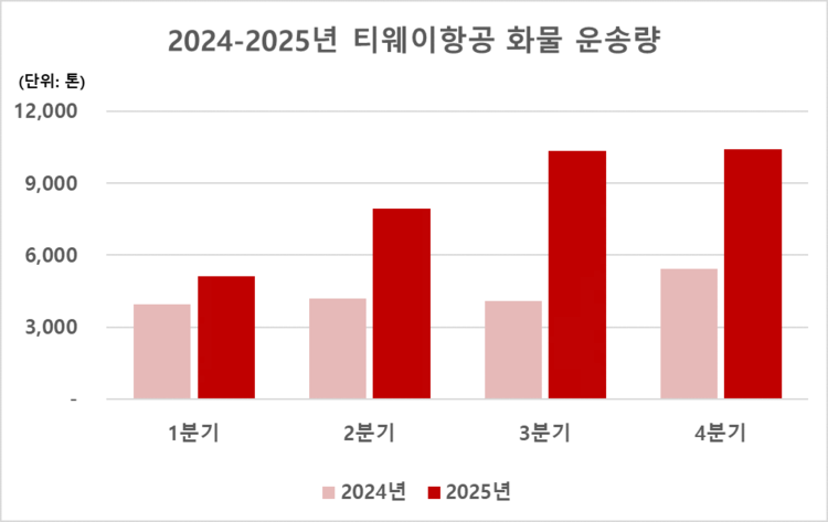 【 청년일보 】 티웨이항공은 2025년 화물 운송 실적 3만4천톤을 달성하며 역대 최대 화물 실적을 기록했다고 19일 밝혔다. 이는 2024년 실적인 약 1만8천톤 대비 92% 증가한 수치다.
