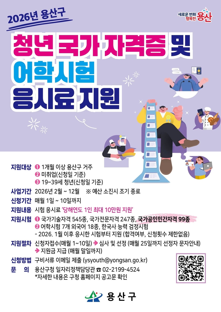 【 청년일보 】 용산구는 올해 '청년 국가자격증 및 어학시험 응시료 지원 사업'의 지원 대상을 종전보다 100여명 늘리고 국가공인민간자격 99종을 추가했다고 19일 밝혔다.