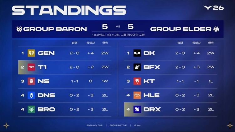 지난 14일부터 18일까지 서울 종로구 치지직 롤파크에서 열린 2026 LCK컵 1주차 경기에서는 바론 그룹과 장로 그룹이 각각 5승 5패로 팽팽하게 맞섰다. 그룹 간 격차가 크지 않은 가운데, 팀별 완성도 차이가 초반 성적을 가른 모습이다.