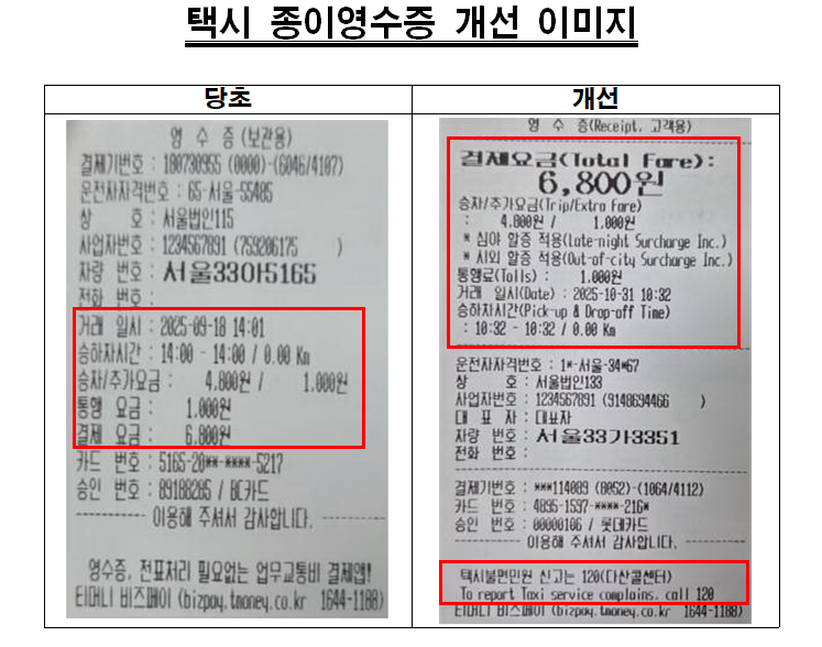 시는 이러한 문제를 원천 차단하기 위해 우선 택시 종이 영수증을 개선한다. 기존 영수증은 한글로만 표기되어 있어 외국인이 요금 내역을 이해하기 어렵다는 지적이 제기되어 왔다. 이에 따라 지난달부터 티머니모빌리티와 협력해 최종 요금, 승하차 시간 등 주요 정보를 영문으로 병기하도록 했다.