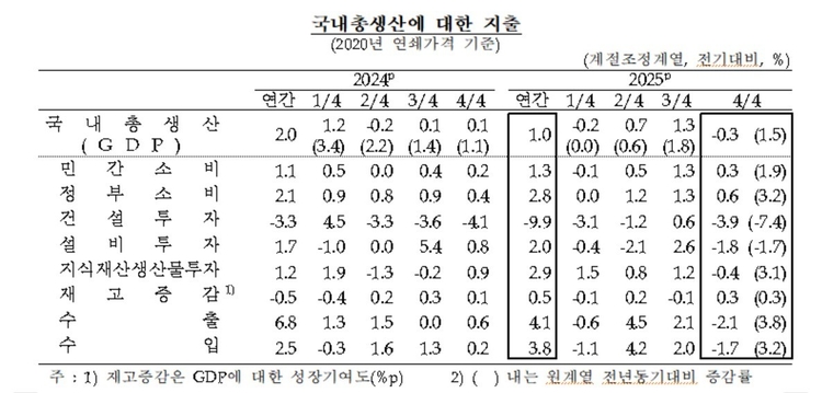 분기 성장률은 2024년 1분기 1.2%를 찍은 뒤 2분기엔 -0.2%까지 추락했다가, 3분기(0.1%)와 4분기(0.1%) 정체를 거쳐 작년 1분기(-0.2%) 다시 뒷걸음쳤다. 이후 2분기(0.7%) 반등에 성공한 뒤 3분기(1.3%) '깜짝 성장'했지만 4분기 다시 역(-)성장을 기록했다. 4분기 성장률은 한은이 두 달 전 제시한 예상치(0.2%)보다 0.5%p 낮았다. 2022년 4분기(-0.4%) 이후 3년 만에 가장 낮은 기록이다.