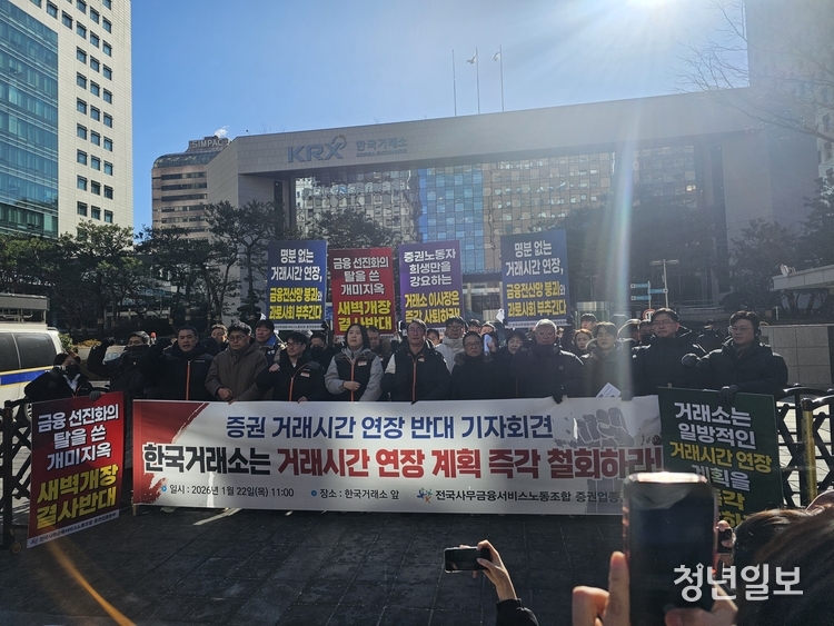 【 청년일보 】 전국사무금융서비스노동조합 증권업종본부(이하 사무금융노조)가 한국거래소(KRX)의 증권 거래시간 연장 추진에 대해 “명분 없는 졸속 정책”이라며 강하게 반발했다.