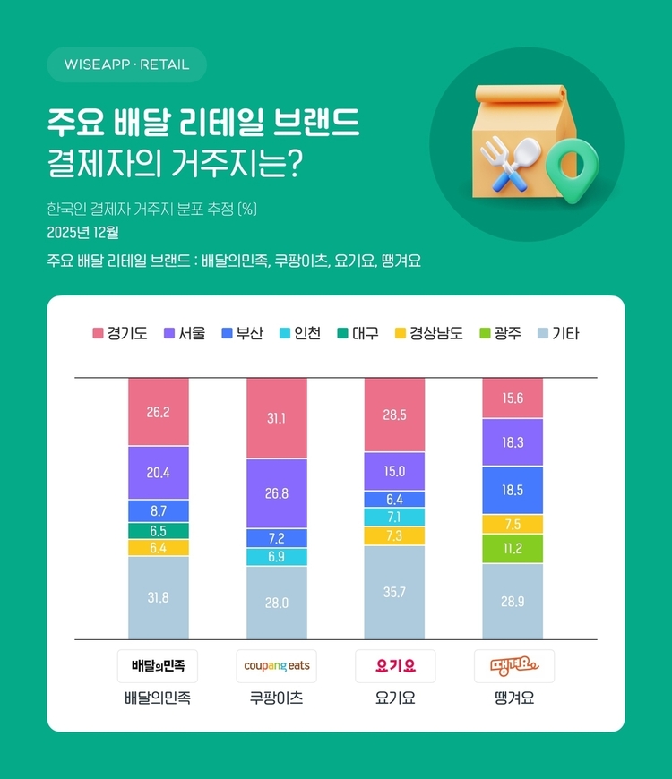 배달 앱 결제자 거주지 분포를 보면 배민·쿠팡이츠·요기요는 공통으로 경기도 거주자의 결제 비율이 가장 높았다.