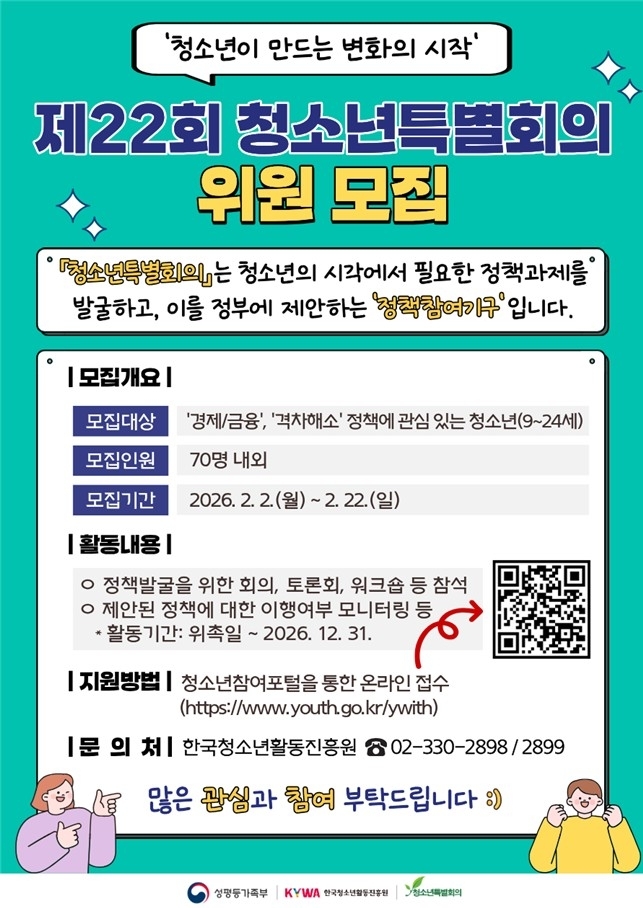 성평등가족부는 '제22회 청소년특별회의' 청소년위원을 22일까지 모집한다고 2일 밝혔다.
