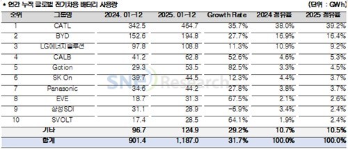 LG에너지솔루션은 배터리 사용량이 108.8GWh로 전년 동기 대비 11.3% 늘며 점유율 9.2%로 3위를 유지했다. SK온은 44.5GWh로 12.3% 증가하면서 3.7%의 점유율로 6위를 차지했다. 반면 삼성SDI는 28.9GWh로 상위 10개 업체 중 유일하게 사용량이 감소(6.9%)한 것으로 나타났다. 리비안의 판매량 부진이 삼성SDI의 공급 비중에 부정적인 영향을 미친 것으로 분석됐다.