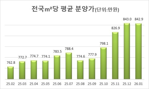 민간 아파트 분양가는 지난해 하반기 내내 가파른 상승 곡선을 그렸다. 전국 ㎡당 평균 분양가는 작년 9월 778만원에서 11월 800만원을 돌파하며 오름세를 지속했으나, 해가 바뀐 1월 들어 상승 흐름이 멈췄다.