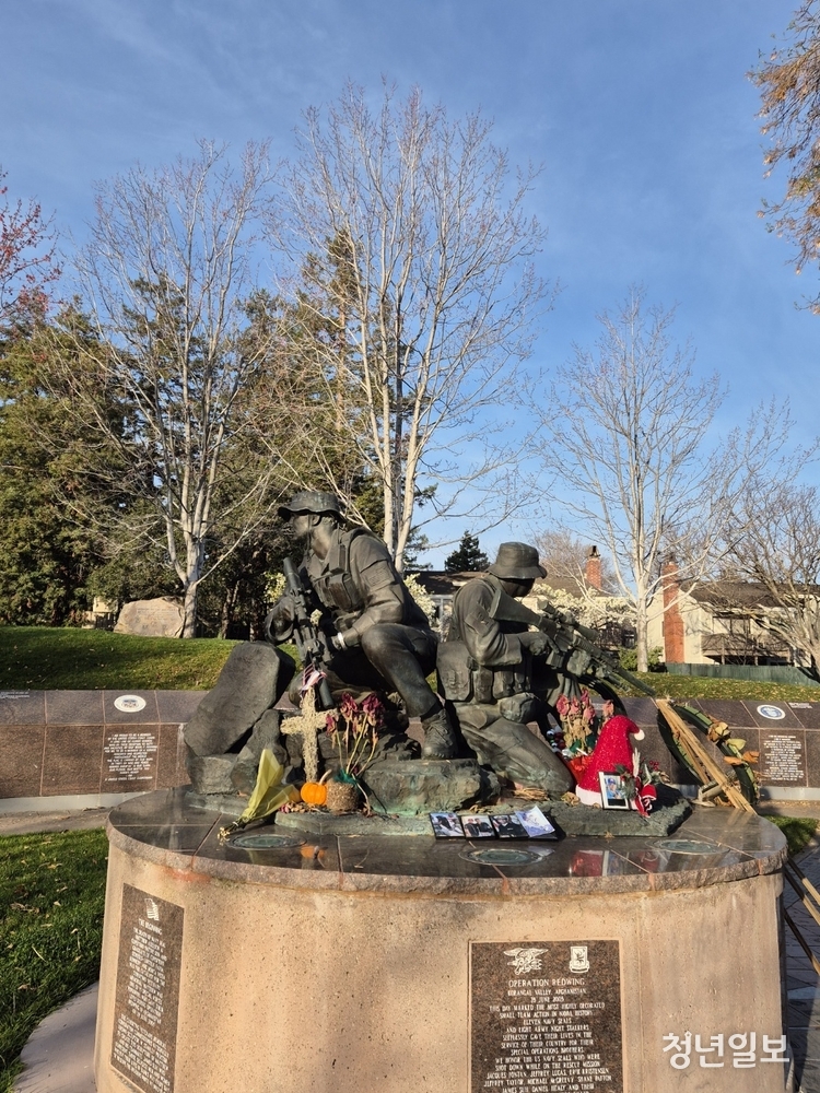 조형물 주변에는 미국이 겪었던 주요 전쟁들을 기념하는 돌들이 둘러서 있어, 한 걸음씩 옮길 때마다 20세기와 21세기를 관통한 전쟁사의 단면을 마주하게 된다. 그 가운데 한반도 지도를 새긴 한국전쟁 기념석은, 이 작은 도시와 머나먼 한반도가 어떻게 연결되어 있는지를 상징적으로 보여준다.