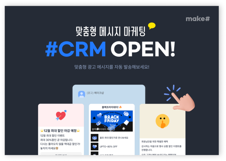 #CRM(Customer Relationship Management)은 고객 특성에 맞춘 카카오 기반의 오디언스 마케팅 메시지를 보낼 수 있는 서비스로 메이크샵이 다년간 수십만 상점의 운영 데이터를 기반으로 대용량 검색엔진 시스템을 구축해 자체 개발한 솔루션이다.