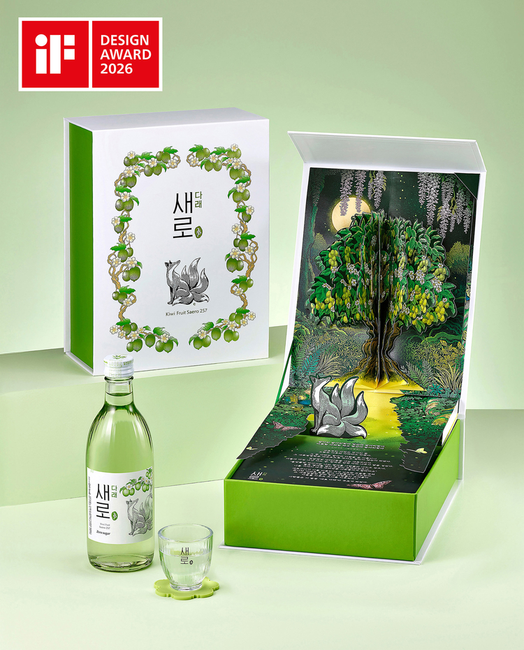 '새로 다래'는 한국 설화 속 구미호를 현대적으로 재해석한 제로 슈거 소주로, 병 라벨과 선물용 패키지에 구미호가 다래 향을 맡는 순간을 시각화했다. 스토리텔링을 기반으로 전통적 서사와 팝업 구조의 인터랙티브 패키징을 활용해 소비자의 체험 경험을 확장했다.