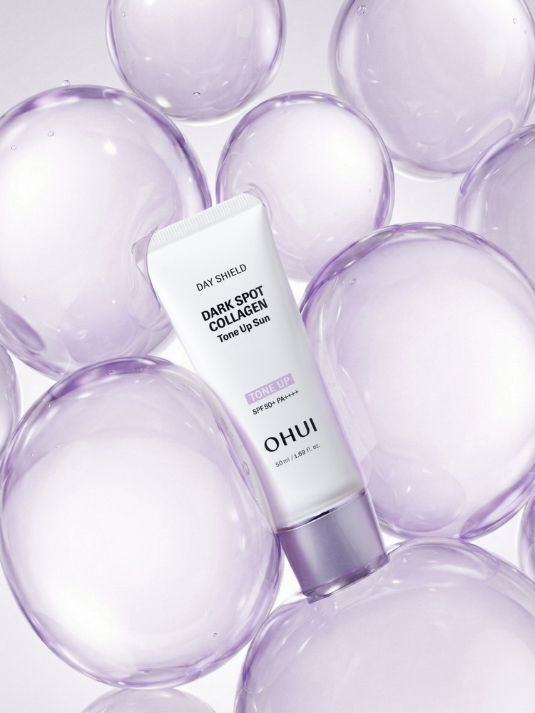 오휘 데이쉴드 다크스팟 콜라겐 톤업 선은 무기자차와 유기자차의 장점을 결합한 '혼합자차' 제형이다. 제품 사용 2주 만에 자외선 손상 피부가 38.4% 진정되고, 피부 결은 10.3%가 개선되는 광노화 개선 효과가 나타났다고 회사 측은 설명했다.