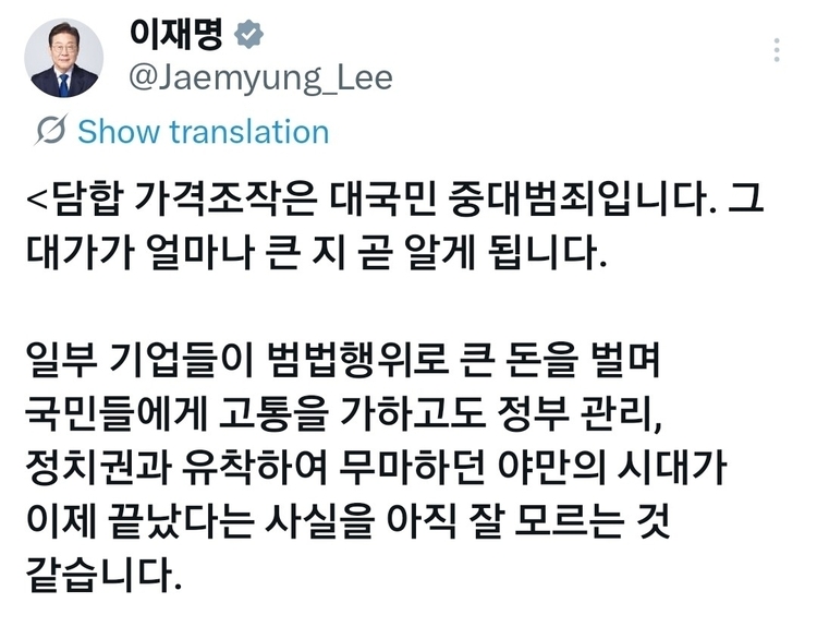 이 대통령은 6일 자신의 엑스(X·옛 트위터) 계정에 전날 국무회의에서 유류 최고가 지정제를 지시하면서 정유업계에 긴장감이 번지고 있다는 취지의 기사를 링크하며 "담합 가격조작은 대국민 중대범죄다. 그 대가가 얼마나 큰지 곧 알게 될 것"이라고 말했다.