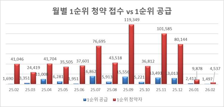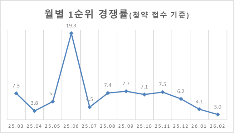 10일 분양평가 전문회사 리얼하우스가 청약홈 자료를 분석한 결과, 2026년 2월 전국 1순위 평균 경쟁률은 3.03대 1로 집계됐다.